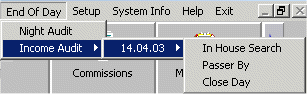 Each date has the option of choosing In House Search, Passerby and Close Day. The least recent open business date also has a Close Day option. Here you can make corrections and adjustments if the Audit Date has not been closed.
