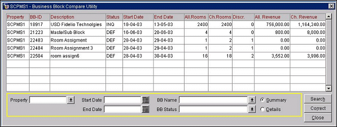 For any selected business blocks, the Business Block Compare utility compares the number of rooms allotted and room allotment revenue figures shown on the business block room grid with the same information computed from the total activity recorded in the change log. Business blocks for which a mismatch exists are displayed in the Business Block Compare Utility grid. In the event of a discrepancy, you can use the utility to correct the change log so that the values on the business block room grid and change log agree.