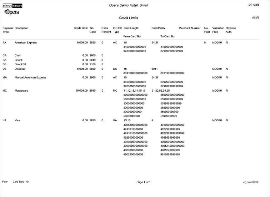 The Configuration report for Credit Limits will display the Credit Limits that have been configured for your property.