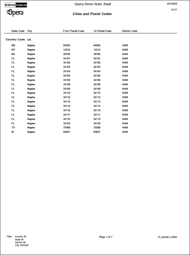 The Configuration report for Cities and Postal Codes will display Cities and Postal Codes that have been configured in the application.