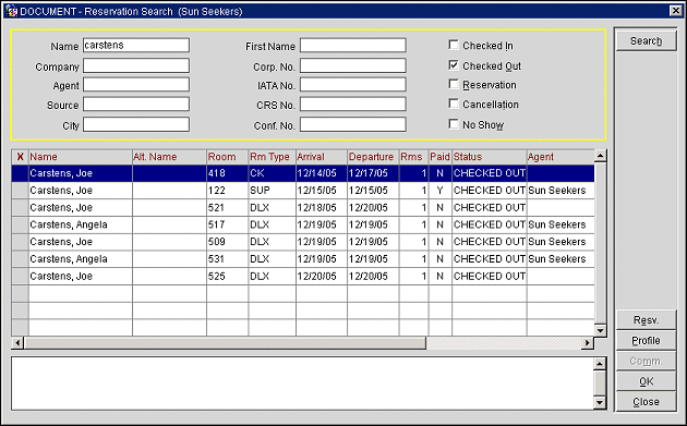 Profile. To view the profile associated with the reservation, highlight your choice and select the Profile button. Then, select the Agent, Source, or Company button to view the profile, but only if one of these types of profiles are associated to the reservation.