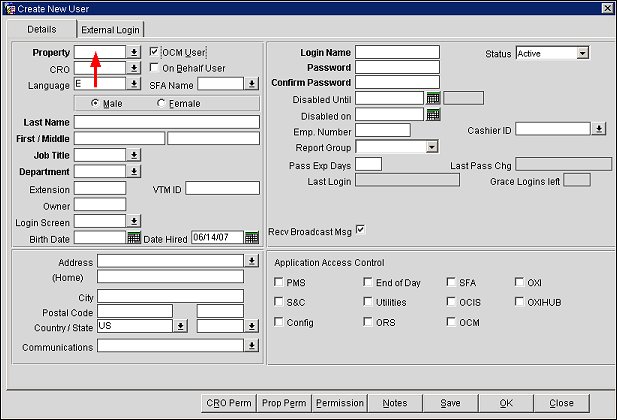 Once the default property is assigned, the user should be granted property permissions for access in the OCM application. To grant property permissions to the user, select the Prop Perm button and select the properties from the list of values.