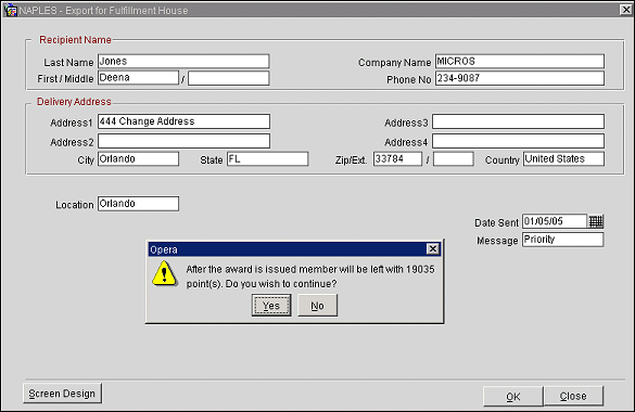 The Export for Fulfillment House screen appears after you select the Export Info button from the Member Awards Based on Other screen or the Member Award List (accessed from Profile screen>Options>Memberships>Award List>either Export Info button or Issue button>Award Based on Other>Availability>Export Info. This screen is available when the OPI<version number>OCIS license code is active. You can either issue an award based on Other through a fulfillment house or send the award information directly to a fulfillment house from this screen, depending upon from where you navigated.