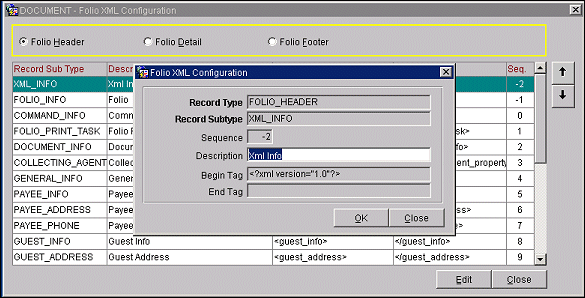 Note: The up and down arrows are not available for XML_INFO, FOLIO_INFO, and COMMAND_INFO. The sequence cannot be changed for these elements. They have assigned sequences of -2, -1, and 0, respectively.