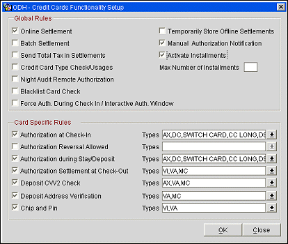 Note: When the IFC > CHIP AND PIN application parameter is set to Y, the payment type CP is available for credit card transactions. CP payment type is not displayed in the Types LOV for selection. In case the credit cards functionality setup has been configured to use Online Settlement as well as the Authorization Settlement at Check Out (with some payment types selected), the CP payment type will behave per Online Settlement. If Authorization Settlement at Check Out is selected and Online Settlement is not selected, the CP payment type will behave per Authorization Settlement at Check Out.