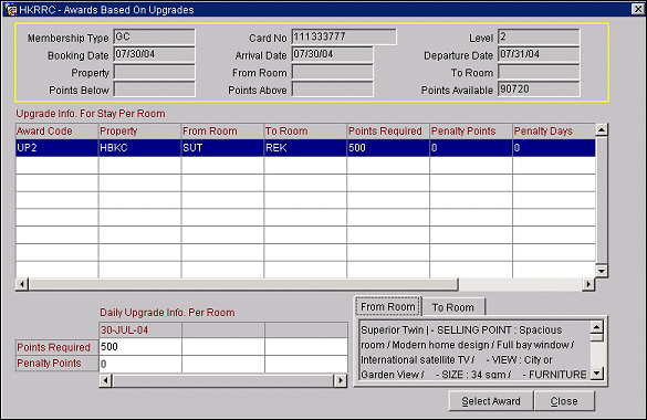 If you select Upgrades as the basis to issue an award from the Query Awards screen and select the Availability button, the Awards Based on Upgrades screen appears. At this screen, view the list of awards displayed based on the criteria you chose, including the arrival and departure dates. Highlight the award you want to grant and select the Select Award button.