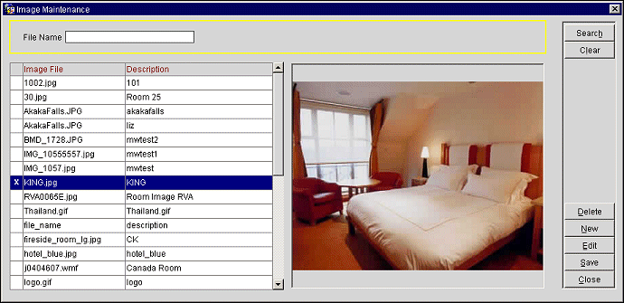 If an image has already been attached to the room type or room, it is displayed in this screen. The Detach button is available only if an image is already attached. Select Detach to un-associate the image from the room or room type. Select the Attach button on the  Image screen to select the image you want to associate with the room type or room.  The Image Maintenance screen appears.