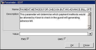To view the available payment methods at the Kiosk, select the Payment Methods For Checkin But WO Advance Bill Option setting, and select the Edit button.