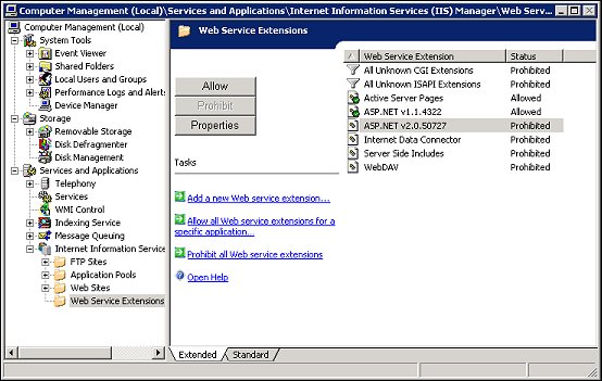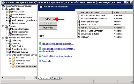 3. Verify that the Web Service extension status is Allowed (and not Prohibited). If the status is Prohibited, place your cursor on the ASP .NET v2.0.xxx Web Service extension and select the Allow button.