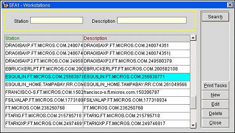 Print tasks are used to define the specific printer where various printed output from Opera should be processed when requested from each workstation. To define the print tasks for a specific workstation, highlight the workstation from the Workstations screen and select the Print Tasks button. The Print Tasks screen appears. This screen displays the printer tasks that are attached to this specific workstation and allows you to add new ones.