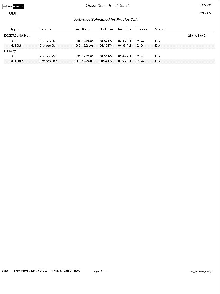 The Activities Scheduled for Profiles Only report displays activities that are associated to profiles and not reservations and that fall within the date range selected.