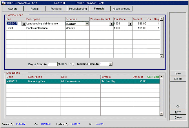To define the fees and deductions associated with an owner contract, select Ownership > New Contract to create a new contract, or Ownership > Update Contract to update an existing contact.