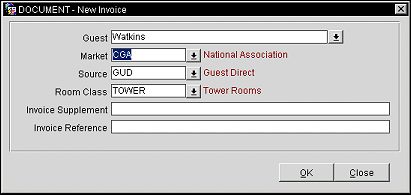 Guest. Select the down arrow to choose the name to be attached to the invoice. By default, the name on the AR account appears in this field. If you change the name, the Profile Search screen prompts you to select the name from existing profiles or to create a new profile.