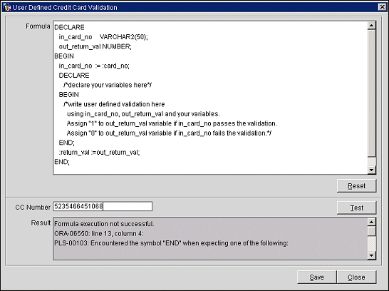 If you select User Defined as the validation rule, the Formula button becomes available.  Select this button to open the User Defined Credit Card Validation window.  The default validation formula for the interface credit card type selected in IFC CC Type appears. Type (or cut and paste) the appropriate code into the Formula box.  To verify the code, enter a credit card number in the CC Number box and click Test. If the code verification is successful, select the Save button to save the validation formula.