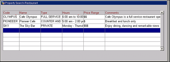 The Property Search - Restaurant screen appears when you select the Restaurant tab on the Sales Screen's Properties display. The Property Search - Restaurant screen provides a list of the restaurants that are available at  the property that is currently highlighted on the Properties screen.