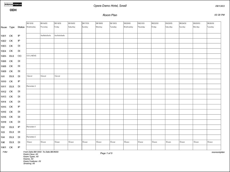 The Room Plan Report displays a functionally enhanced summary of the availability of each individual room in the property, showing 15 days per display. For each room, room number and room type information is shown. Print this "rack of rooms," or "rooms-at-a-glance" report to verify the correct room blocking for individuals and groups or to assist with blocking when the property is near to capacity.