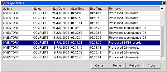 Resync History. Select this button to view when the resync option had last been executed and its status. This will display all resync options that have been executed. See Resync History below.