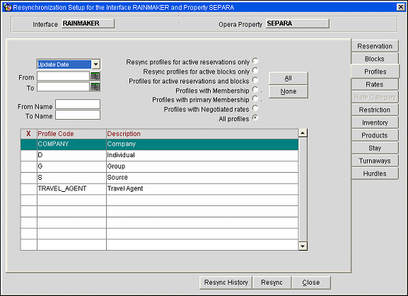 Generic Resync of Data to the External System at Any Time - The Resync options can be run individually and in no particular sequence at any time to resync specific data to the external system. One reason for this could be to send all reservations that have not received an external system number during the original transmission. It is recommended that reservations only be resynced once it is certain that the respective rate codes, blocks, and profiles have been built in the external system.