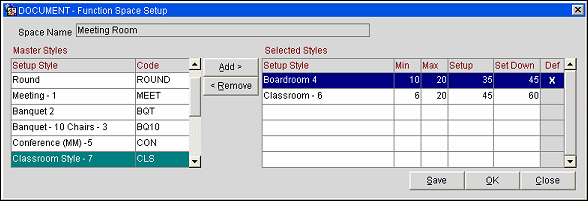 To make a setup style available for the function space identified in the Space Name field, highlight your choice of setup style in the Master Styles grid and pick the Add button. The setup style you chose will be listed in the Selected Style Name grid. Provide the following Minimum and Maximum occupancy, Setup and Set Down times, then select the Save or OK buttons.