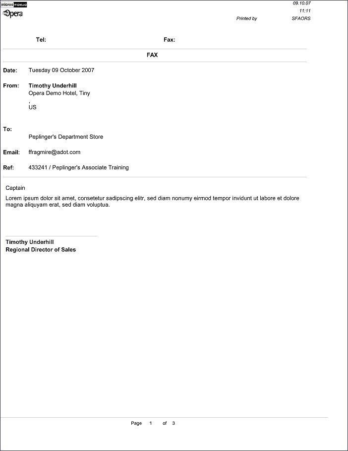 This report presents information similarly to the FIT Contract Merge, in a more scaled down manner. The first page will contain basic contact information for both the sender and recipient along with a section available from free form text useful for faxing the report. The second page contains information according to the selections made on both the Main and Advanced tabs. In this example, you will see the following data: on page 2 and 3 are the Accommodations section that contains the Arrival and Departure date for the lead, the contract number, selected room grid or grids, Meeting Agenda (if one exists) which will display the event, resources and quantity of resources, space type and setup, number of attendees, discount percentage (if one is applied), total budge and total meeting revenue. Next is the Proposal Conditions section which contains the name of the property that can, has or intends to accept the lead and the conditions by which the lead can be accepted. This section can contain multiple entries from different lead properties.