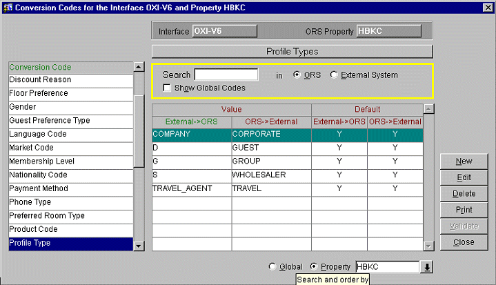 A few conversion codes will be activated and populated through the OXI_HUB installation wizard, as they contain the same values for all interfaces and are never changing. These conversions are set at global level and the respective codes are Reservation Status, Reservation Action Types, Profile Types, and Guest Preference Types. All other conversions can be set at global or property-specific level.