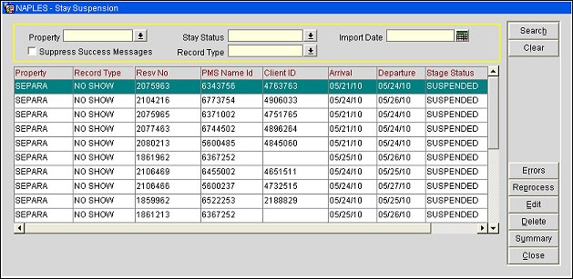The Stay Suspension screen shows records that were rejected by OPERA. For example, a record might not be processed because the check in date is after the booking date. This screen also gives you access to the errors that occurred when processing records. Once you resolve the causes of the errors, you can resubmit the record directly from this screen by selecting Reprocess.
