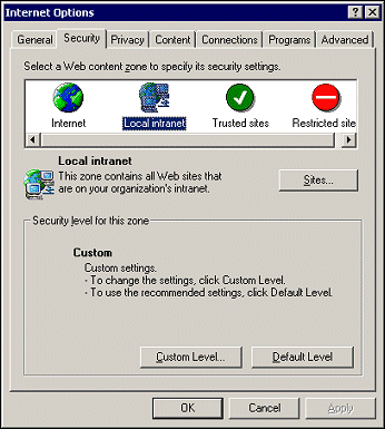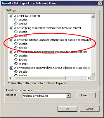 When these restrictions are activated, the created print window will open on the visible screen, but will immediately blur behind the OPERA frame. The restrictions can be deactivated in Internet Explorer Settings (Tools>Internet Options>Security Tab).  Select Local Intranet (or Trusted Sites if the site has been added) and then select the Custom Level button. Finally, enable the option "Allow script-initiated windows without size or position constraints".