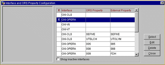 Go into Switch Interface and you see all of your configured global and property interface records. Switch Interfaces is used to switch between various global interfaces or into a property-specific interface without exiting OXI_HUB. The records that have only an interface ID are the global interface records. The respective property records in alphabetical order follow these.
