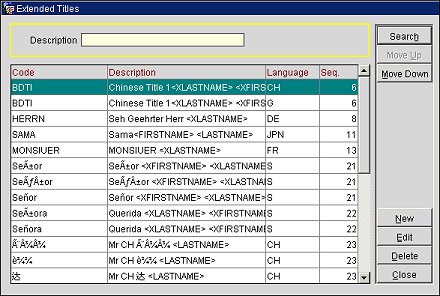 Select Configuration > Profiles > Titles > Extended Title to create or edit codes for alternate titles that use double byte languages. The Extended Titles screen displays. The titles entered here appear in the LOV of alternate titles, for users' selection, on the guest Profile Screen when the Alternate Name globe icon is selected (see Alternate Name for more information). By selecting alternate names and titles, guests from other countries can be identified according to their native custom. For example, if your guest is Japanese and staying at a hotel in New York City, USA, you may want to verbally greet and acknowledge the guest in writing using their originating language, title, and name (i.e. Mr. Suzuki can be identified as Suzuki-Sama. The guest's name and title can also be displayed and written using double-byte Kanji characters, if configured in Character Conversion.)